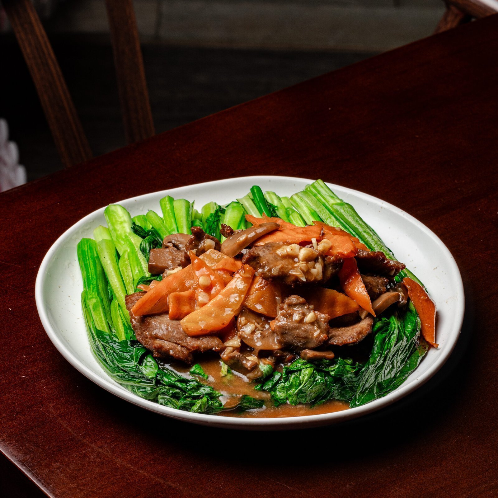 Deliciosas hojas de mostaza salteadas con carne de res.