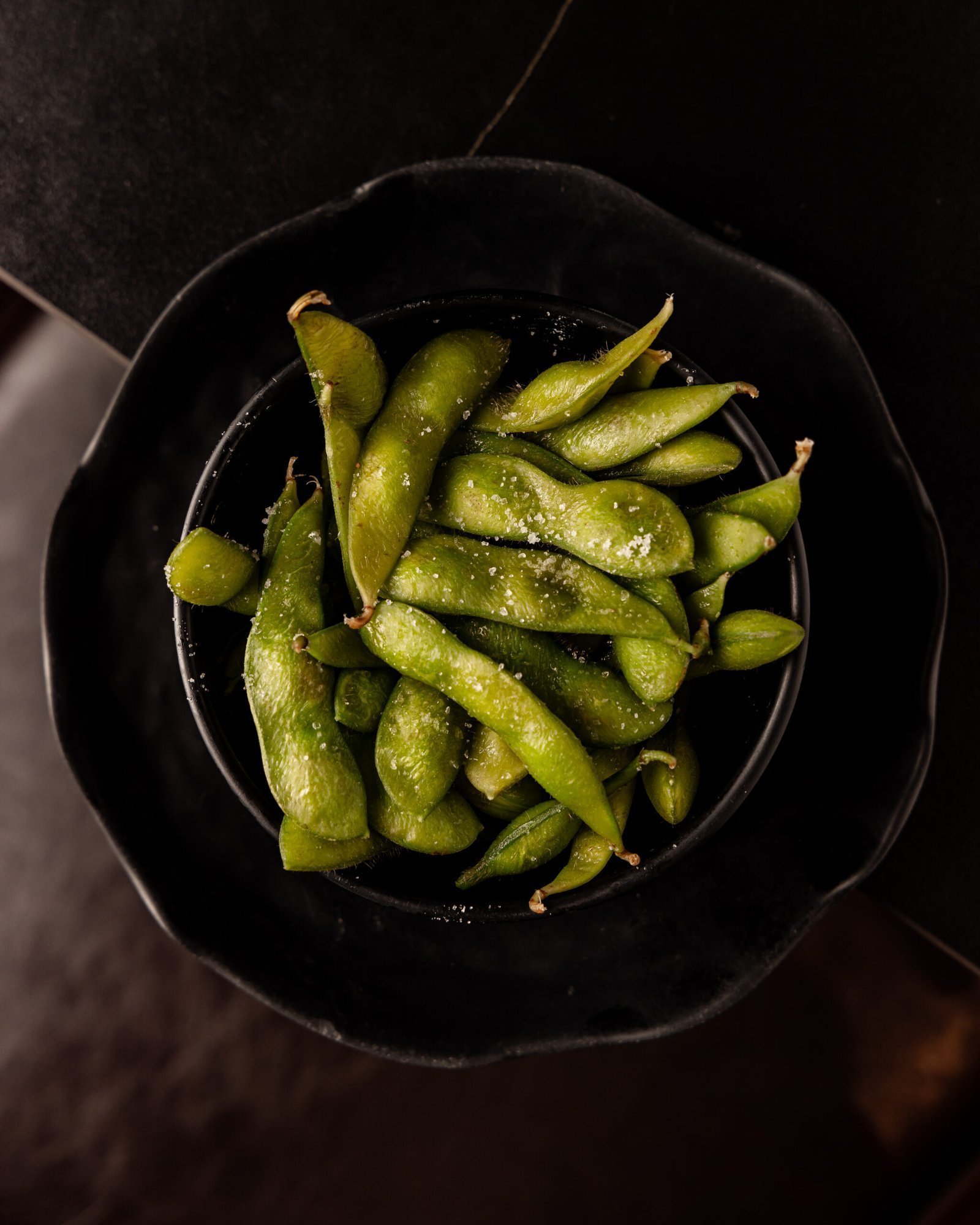 Edamames bañados de sal al vapor.