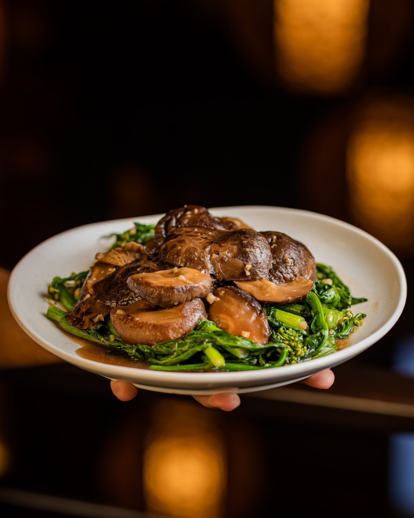 / Hojas de Mostaza Salteado con Hongos Chinos