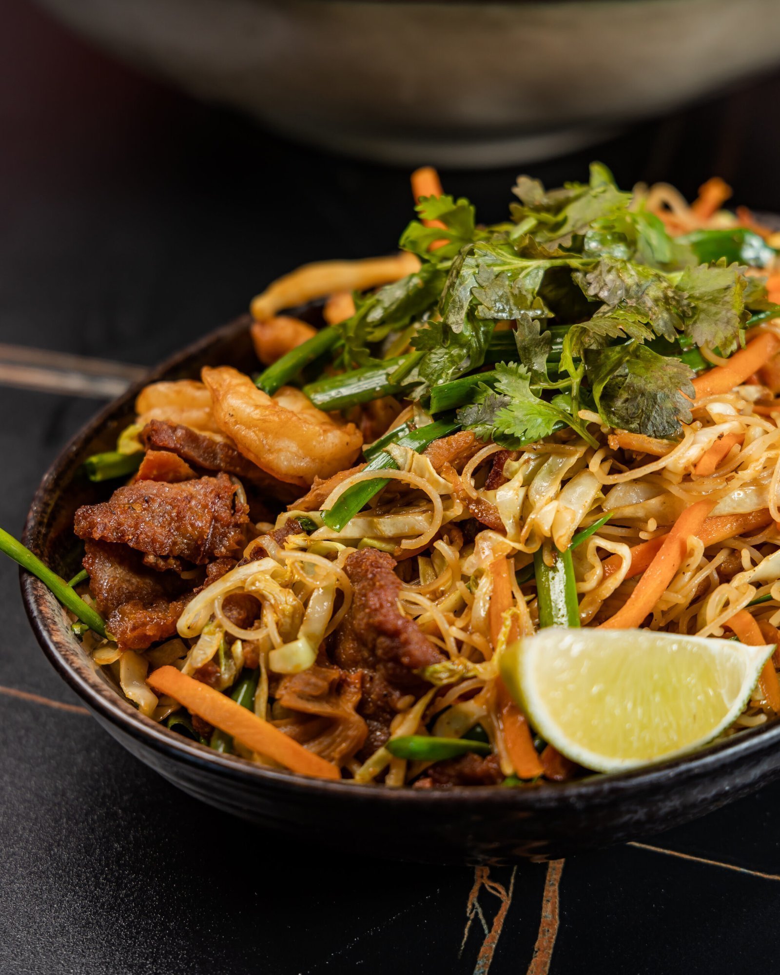 Fideos de arroz, huevo, frijol nacido, cebollina, salsa pad thai de la casa, salteados al wok con su selección de proteina.