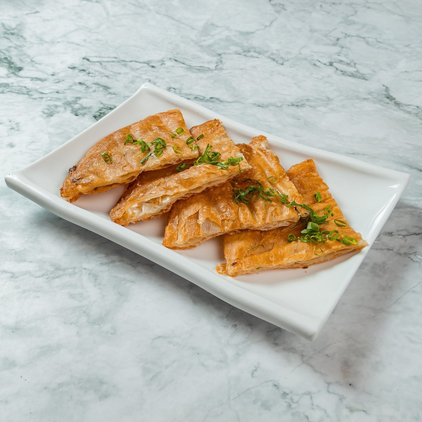 Panqueques delgados hechos con harina de trigo y cebollina picada.