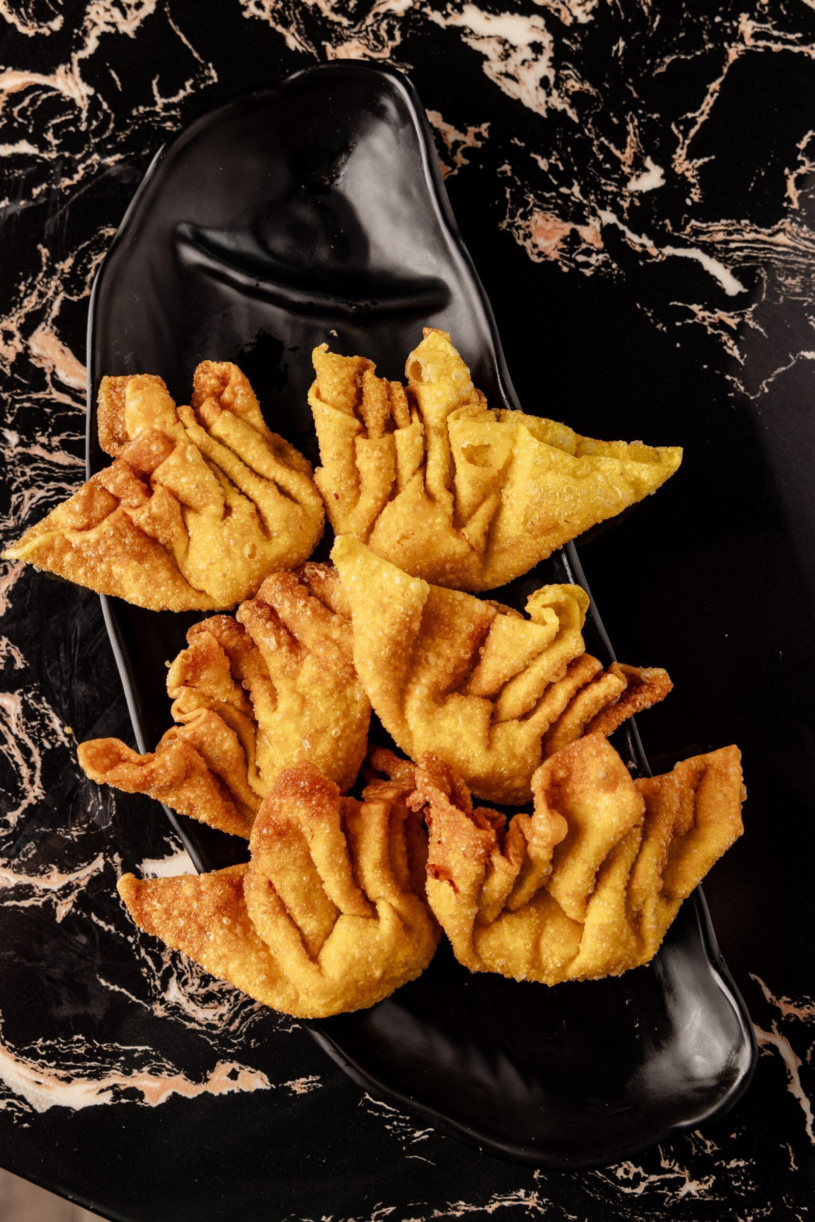 Wantones de camarón hervido y servidos en salsa picante sichuan de la casa.